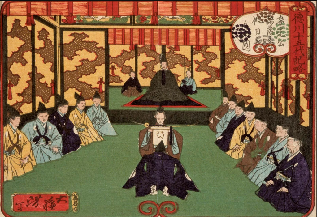 Image: The Tokugawa shogun Iemitsu receiving lords (daimyo) in an audience, colour woodblock print by Tsukioka Yoshitoshi, 1875.